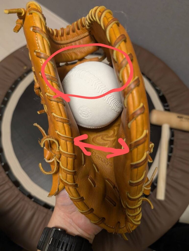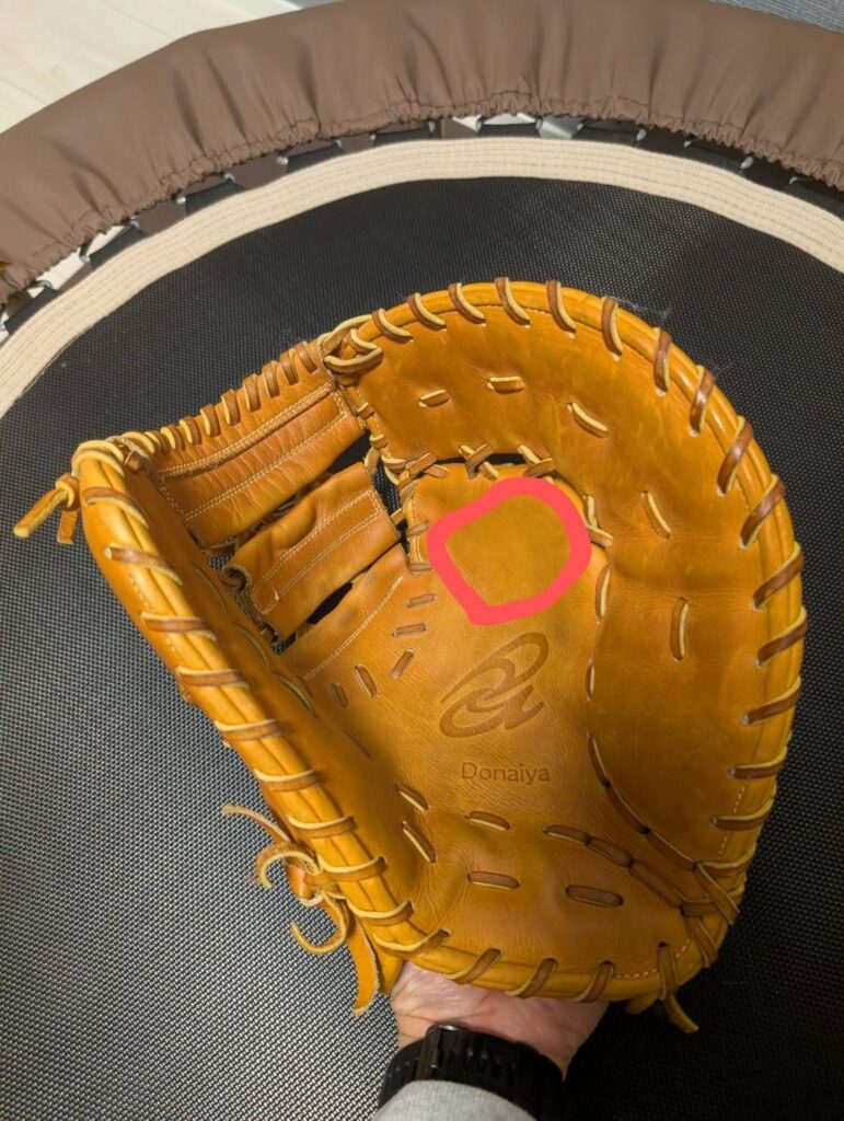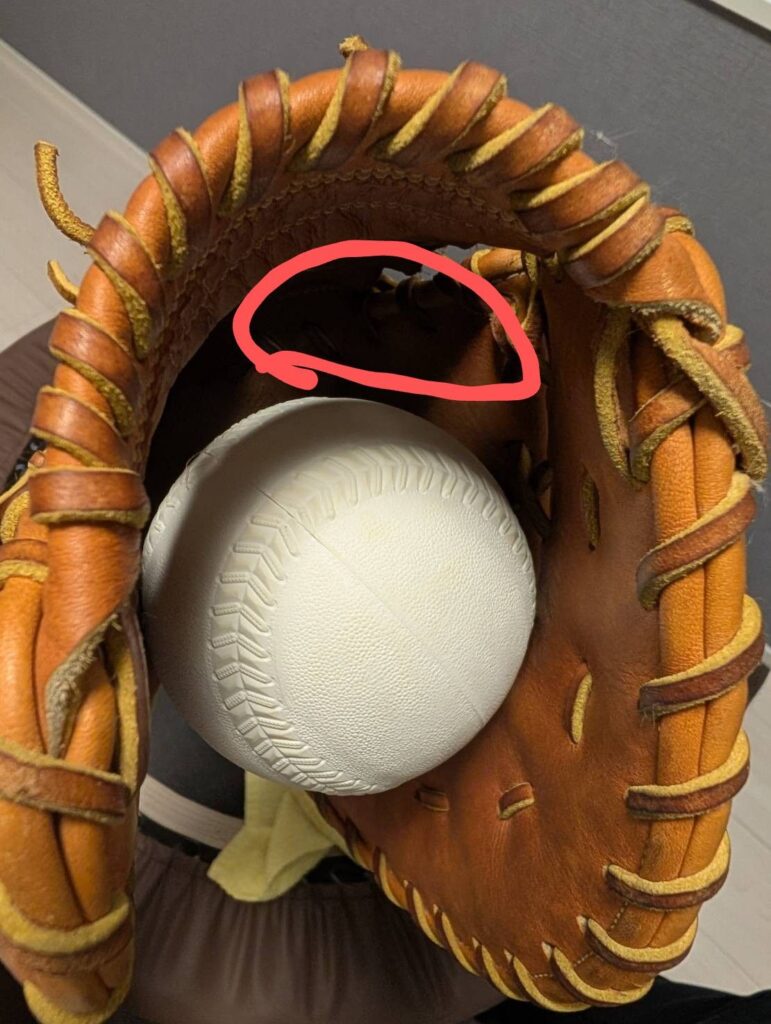 後に別の職人さんに教えてもらったのですが(その方とのやり取りはまた別途記事にしたい!)、ドナイヤのファーストミットは、この赤丸部分が、へたらないようにかなりしっかり作られているとのことで、週末ゴムソフトボーラーには厳しいのでは(なかなか馴染まないのでは)ないかとのこと…