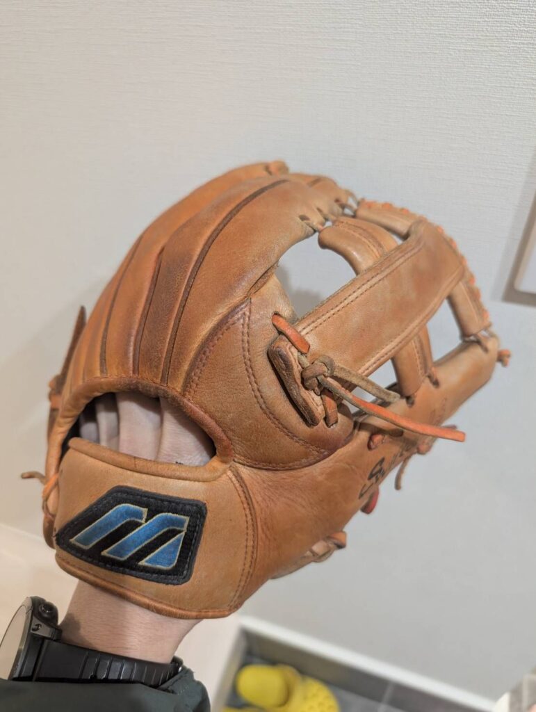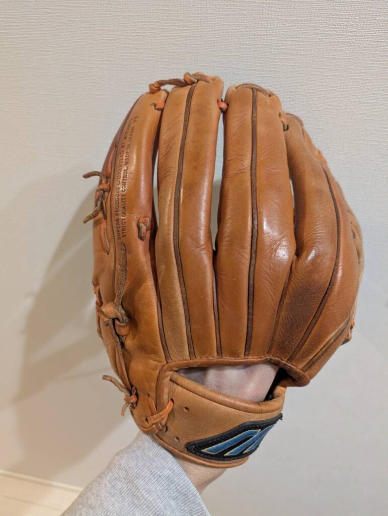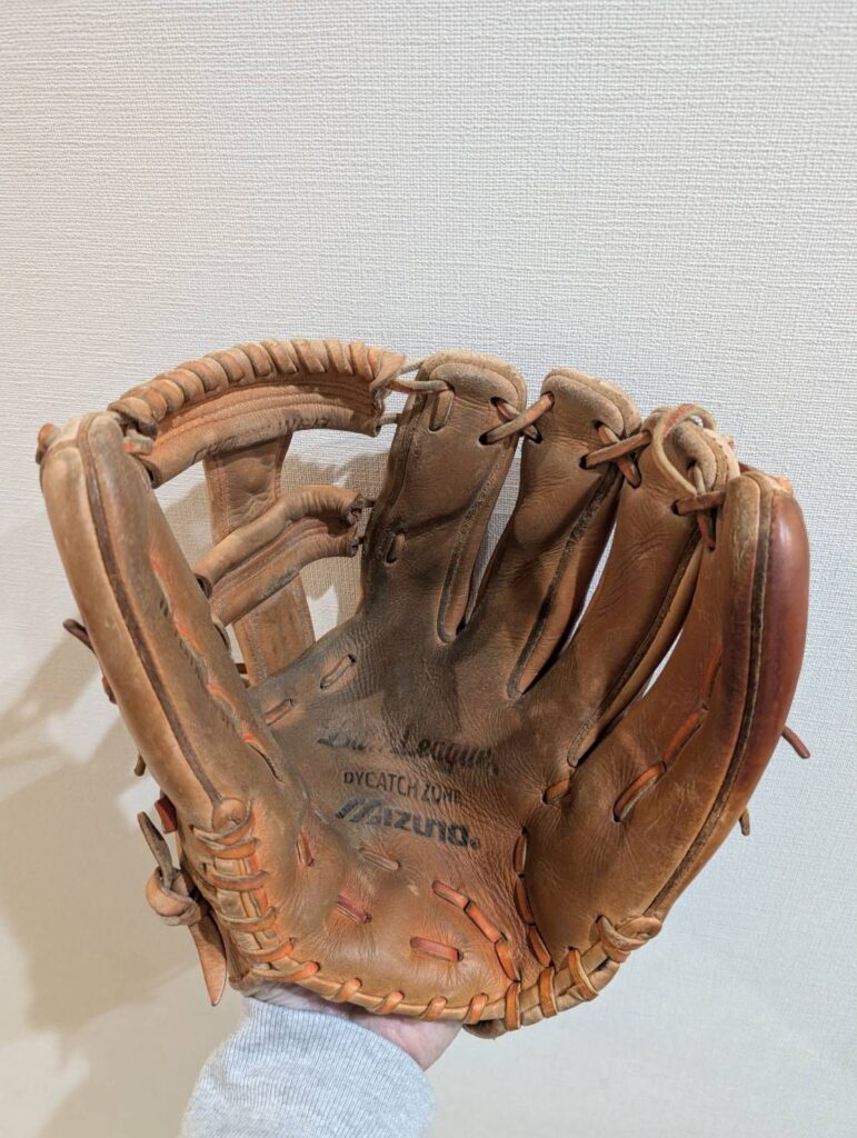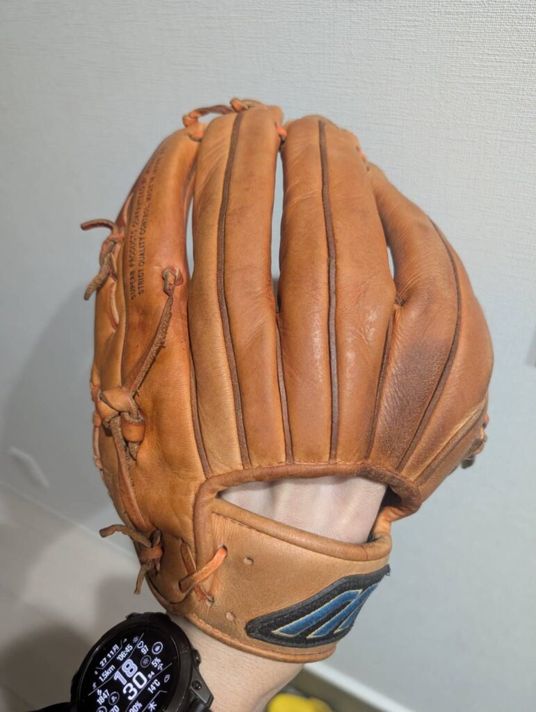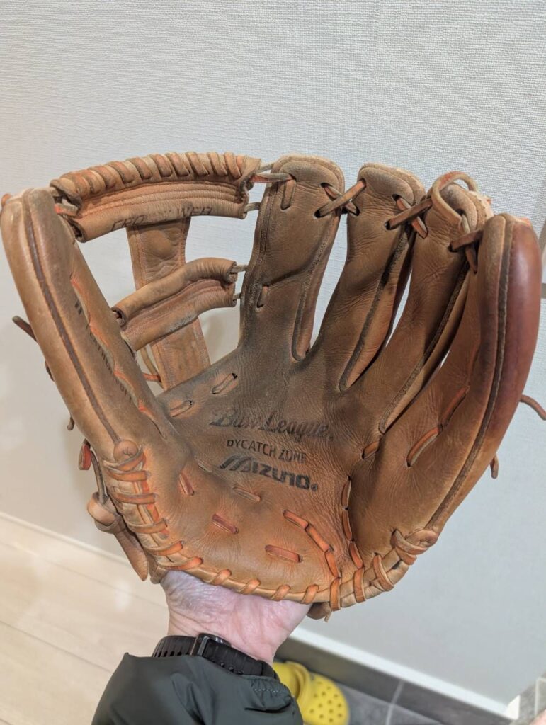 かけてみるグラブはこちら。25年物のグローブです。まだ現役で普段手入れしているため、そんなに状態が悪いわけではなく、普通にまあ乾燥してきたかなくらいの状態です。