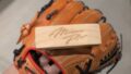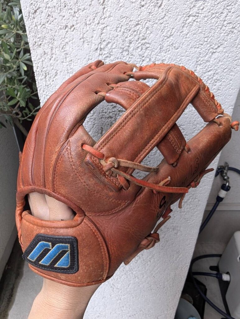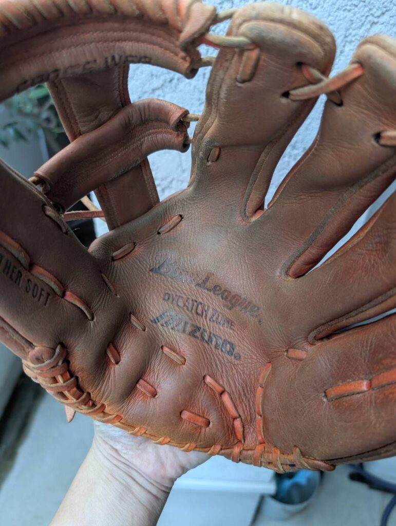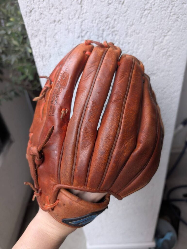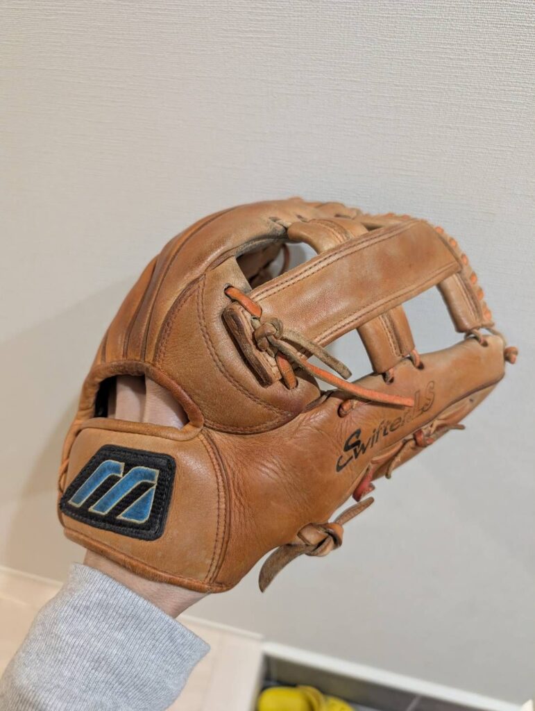 かけてみるグラブはこちら。25年物のグローブです。まだ現役で普段手入れしているため、そんなに状態が悪いわけではなく、普通にまあ乾燥してきたかなくらいの状態です。