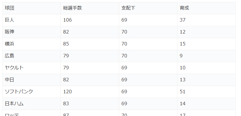 | 球団 | 総選手数 | 支配下 | 育成 |